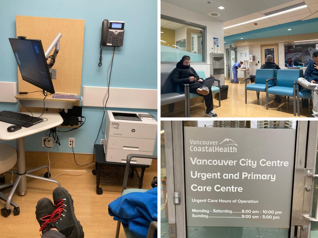 隔天一早直奔 Walk-in Clinic! 其實是滿心期待哈哈哈,一直好想要持續解鎖加拿大的醫療系統,超級有效率耶!我八點到十點就看完醫生結束。從領號碼牌倒掛號、到護士測量基本資訊、醫生問診,都很順暢!有幾個跟台灣的看醫生程序很不一樣的事,護士會在掛號之後一一叫號幫妳做初步的問診跟血壓、血氧測量,如果需要的話她也可以請病人去驗尿抽血,護士在這個時候先給了我止痛藥;醫生問診的時候,不是妳進去診間,而是他們會先把妳放在一間空房間,等醫生有空了會來一間一間看!超酷的! (不過我坐在那裏好久都開始拿筆電工作了)。