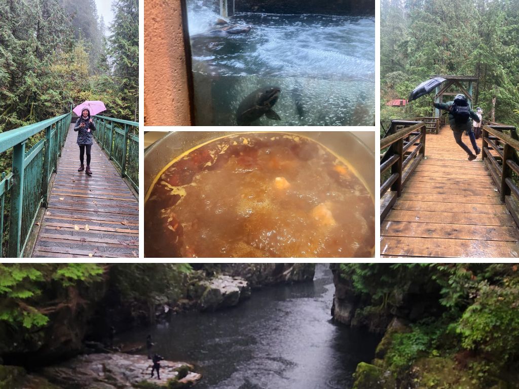 這週他主動提議要一起去 hiking,剛剛好就選在雨很大的週末!真的好幸運的,我們還是照樣去了,一路上聊著火鍋、被窩、電影等等的,身體都被淋濕了但心暖暖的! 最大的驚喜是竟然看到鮭魚洄游了! 在 Capilano river 大壩旁邊有個小小的魚梯,看到成群的鮭魚就這樣扭動身體、跳躍過大約 30 公分高的魚梯! 很驚人啊! 那個一定要回到自己的出生地產卵的衝動,還有扭動的魚兒跳超級高的!