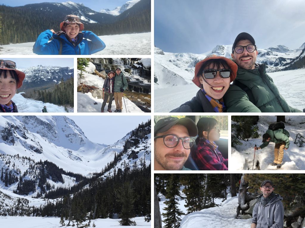 四月中的 Joffrey Lake 竟然還沒有冰融,從山頂到山下的三座湖都還是結冰的狀態。幸好我們有帶上冰爪跟登山杖,有了這兩個幫忙一路上都在擔心會不會滑倒,反而爬起來完全不會累,不知不覺,喘一下休息一下,就到了美麗的冰川湖了!